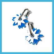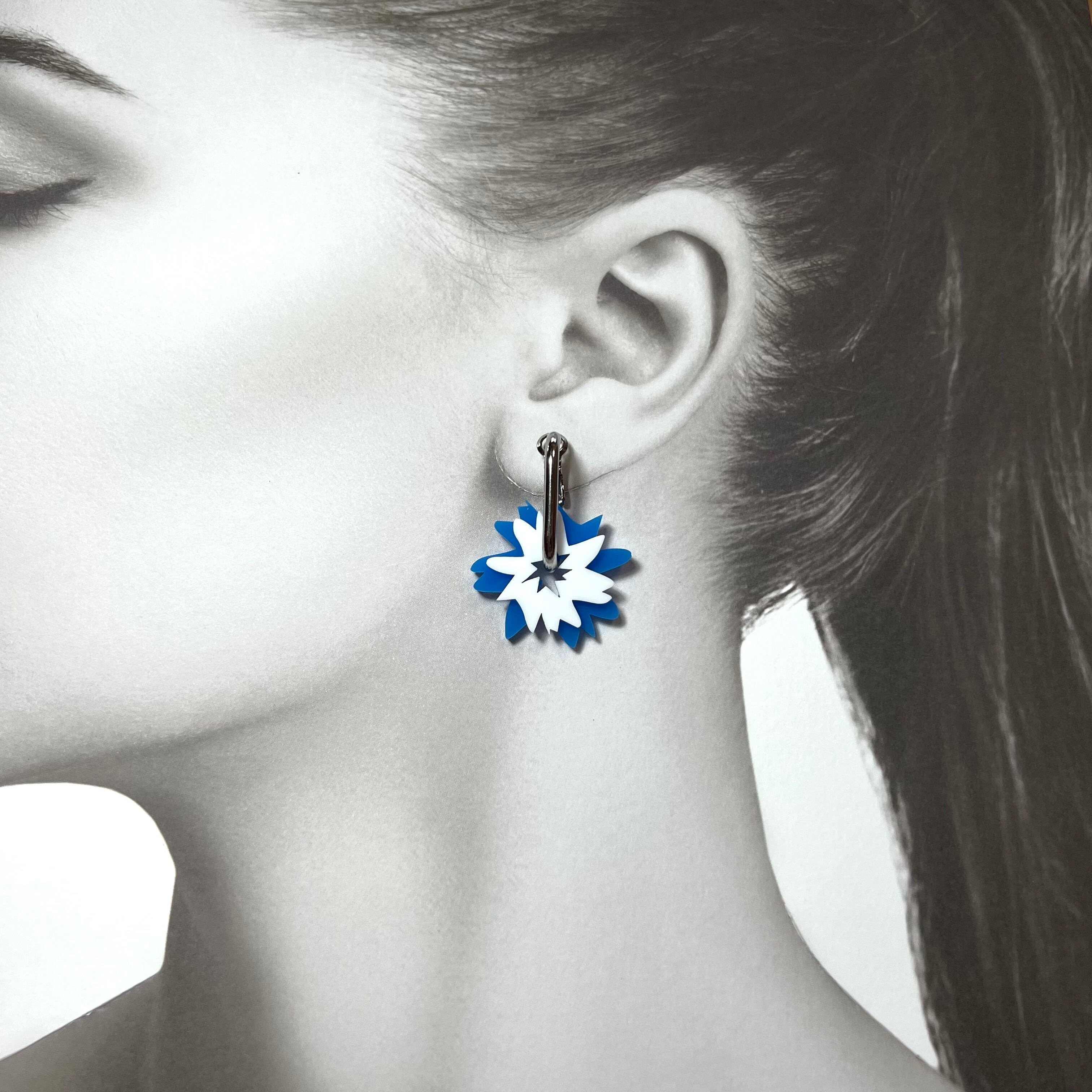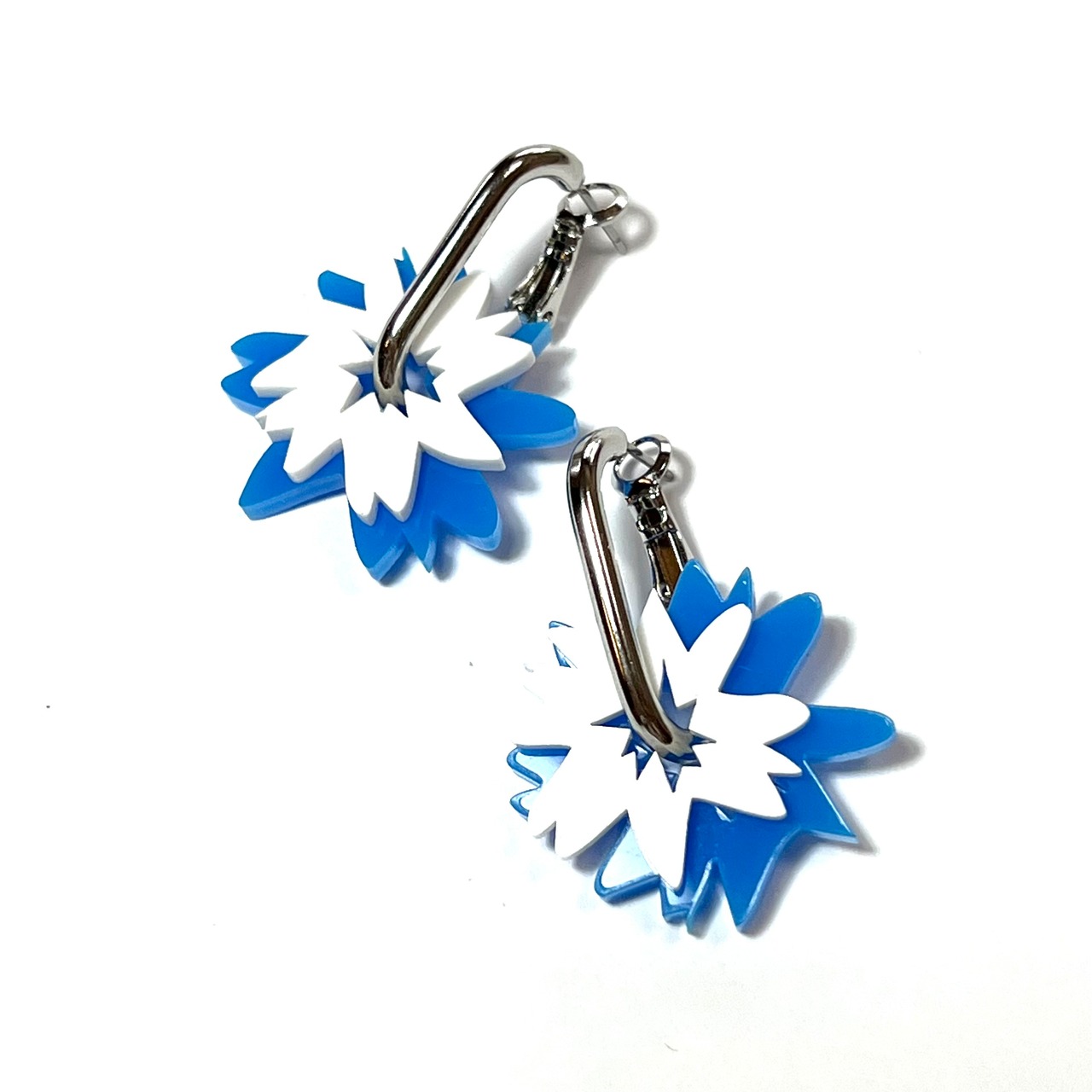 大小色違いの花が配色で入ったフラワーモチーフピアスです。